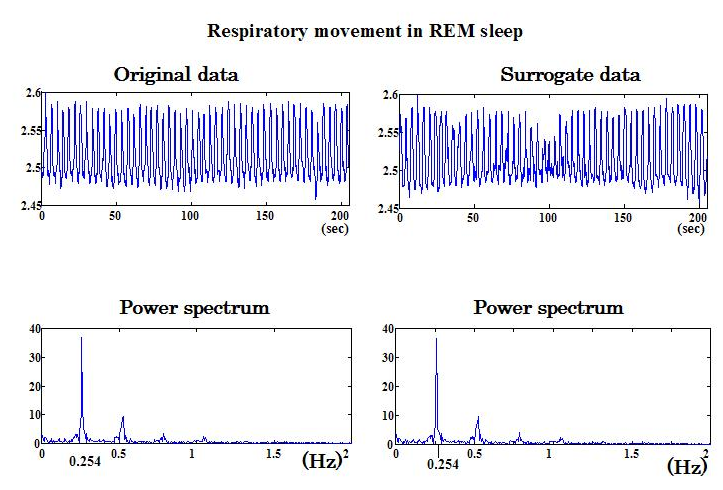 Original dataに非線形性がある場合,surrogate dataから新しい種類の非線形解析により計算された統計量(相関次元,近似エントロピーなど)は,original dataから計算された値より,大きくなる(Clin EEG Neurosci. 36(3):188-93, 2005).通常,original dataから最低39個のsurrogate dataを計算し,比較する.一部の従来報告でoriginal dataから計算された値より,surrogate dataから計算された値が有意に小さい場合も original dataの非線形性ありとした報告があるが,明らかな間違いである.